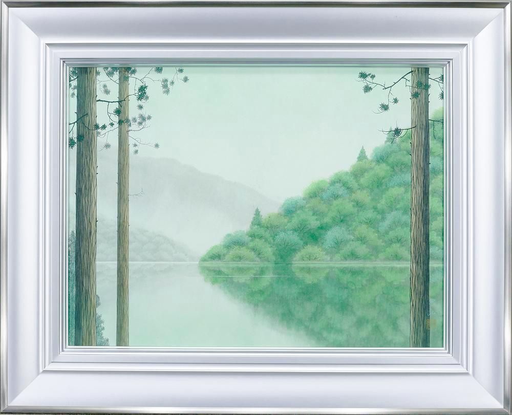 真作 WISH 中村宗弘 湖 日本画 12号 大作 共シール 緑を映す水鏡 幻想的な湖畔名画 〇無所属巨匠 師 東山魁夷