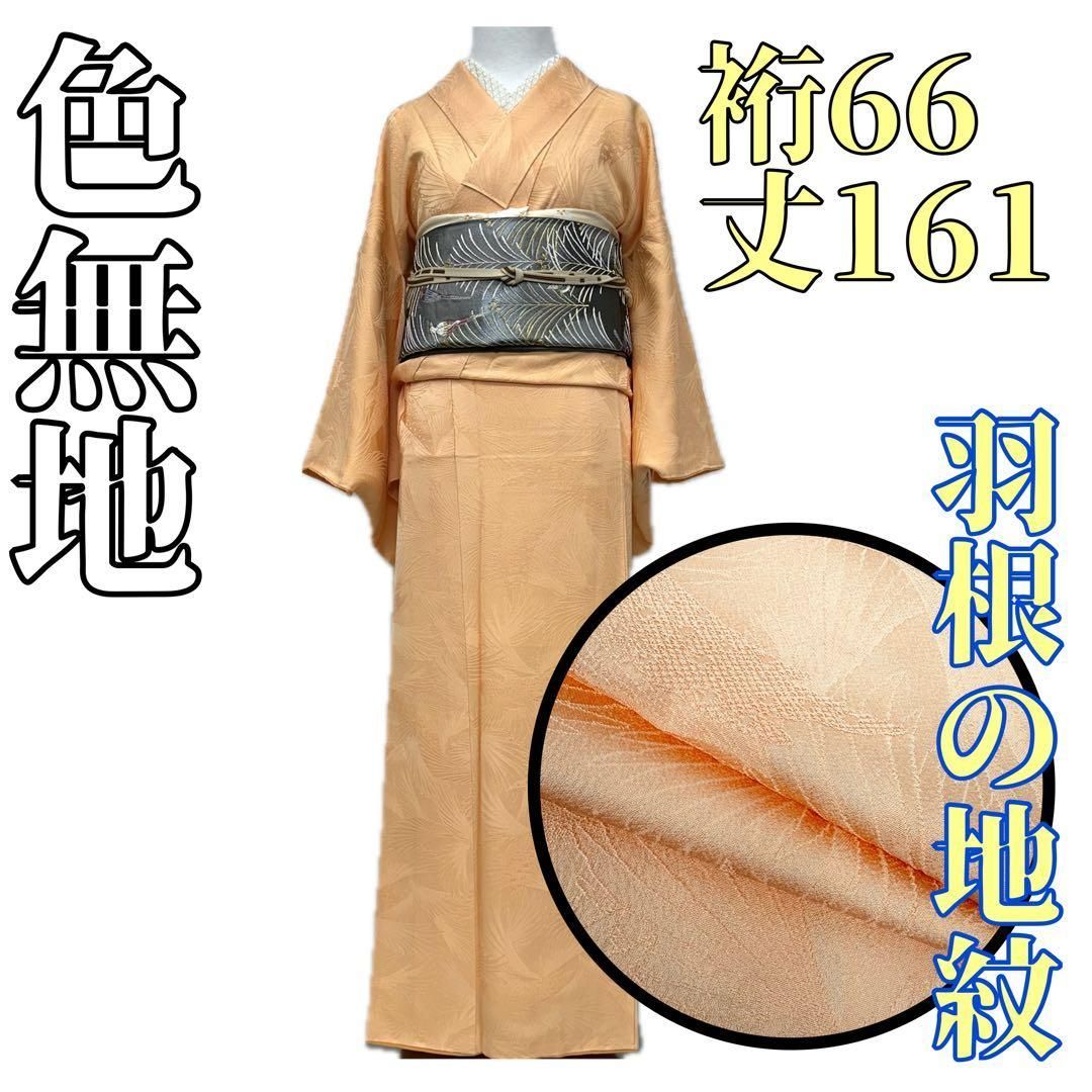 爽やかなペールオレンジの色合いに、羽根の地紋があしらわれた可愛らしい色無地です。光の加減で浮かび上がる羽根模様が上品で、シンプルな中にも遊び心を感じさせます。