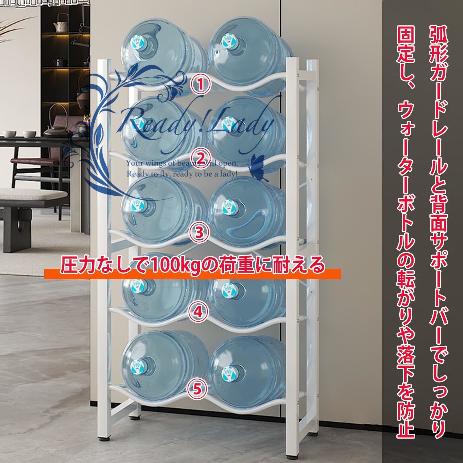 ウォータークーラージャグラック ホルダー ウォーターボトル収納ラック 6 8 10本収納タイプ ウォーターサーバー スタンド 3 4 5層 バケツ収納棚 縦置き型 取り外し 多層棚 ウォーターサーバー用 ボトルラック ホワイト 61 x 33 138 cm