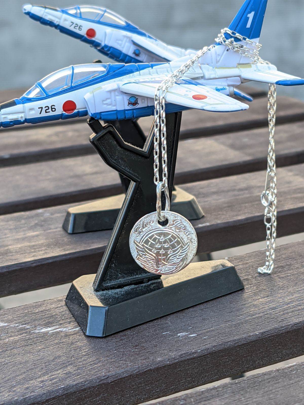ラウンドのネックレストップに、ブルーインパルスロゴマークを描きました。