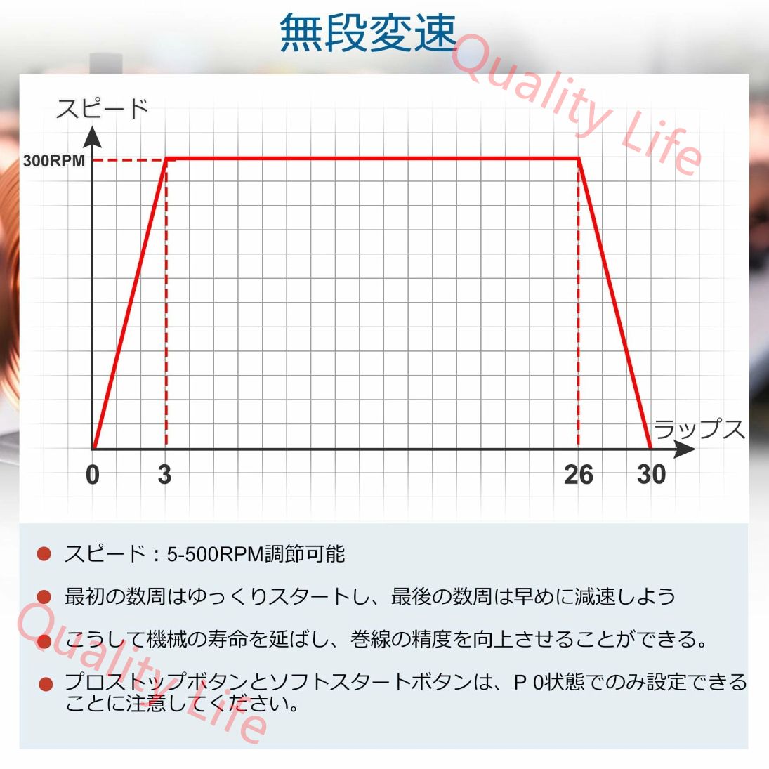ご使用のコツ:巻き始めの数回転にスロースタート機能を、巻き終わり前には減速予告機能をご設定いただけます。これにより機械の寿命延長と巻き精度向上が同時に実現する、プロ仕様の巻線制御が可能です。